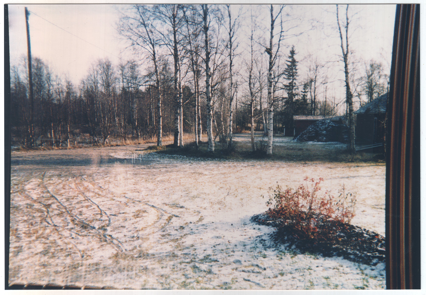Vanha näkymä huoneeni ikkunasta. Olen kuvannut tämän itse, täytteeksi jonkin lomareissun filmirullalle. On todennäköisesti syksy, ehkä ensilumi, kun kuvassa ei näy lumikasoja talven jäljeltä. Kuva tuli vastaan kun kävin läpi Mutsin vanhoja valokuvia, jotka ovat nykyään minulla. Kuvia on ehkä yksi suuri pahvilaatikollinen, vaikka kirjoitinkin aiemmin, että niitä olisi enemmän. Ehkä kolmetoista kansiota ja kaksi tai kolme kenkälaatikollista kuvia irrallaan ja kuvaamon kuorissa. Tällä kertaa halusin nähdä mitä kuvia on olemassa meiltä kotoa 1990-luvulta. Ei niitä kovin paljoa ole, silloin kuvattiin lähinnä lomalla ja juhlissa. Heitin valokuvia roskiin ehkä kenkälaatikollisen verran, sellaisia jotka olivat selvästi kaksois- tai kolmoisvedoksia. Pidän tämän kuvan tunnelmasta todella paljon. Vuosi on todennäköisesti 1996 tai 1997.